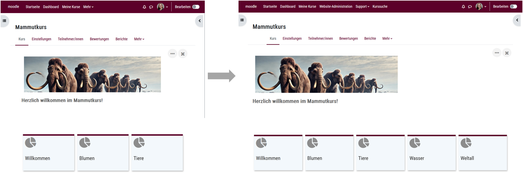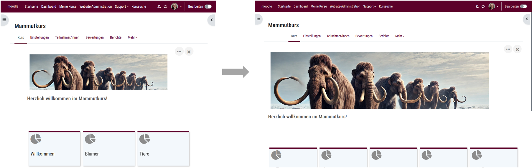 Wenn Moodle-Kurse auf unterschiedlichen Geräten oder in unterschiedlichen Fenstergrößen/Zoomstufen angezeigt werden, kann es passieren, dass die Größe eingebundener Bilder nicht mehr zum Gesamtlayout passt. Zum Beispiel kann ein Header im Kachelformat bei schmaler Darstellung (drei Kacheln nebeneinander) über die gesamte Breite des Kurses gehen, bei breiterer Darstellung (fünf Kacheln nebeneinander) aber nur noch einen Teil der Gesamtbreite abdecken.