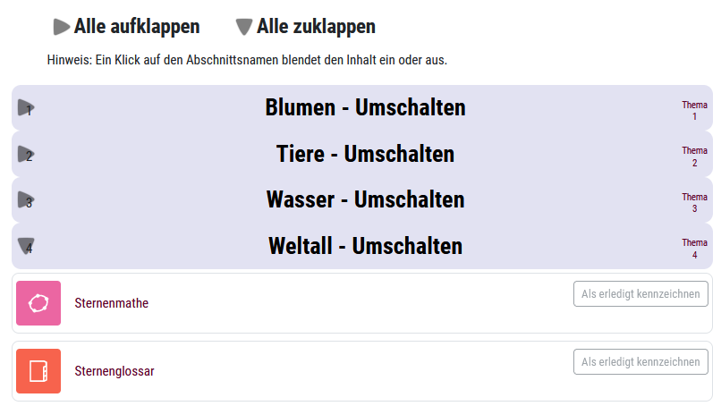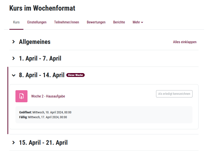 Beim Themen- und Wochenformat können Sie zudem entscheiden, ob alle Abschnittsinhalte auf einer Seite gezeigt werden oder ob jeder Abschnittsinhalt auf einer eigenen (Unter-)Seite dargestellt wird. Letzteres empfiehlt sich bei sehr vielen Kursinhalten. Auf der Startseite stehen dann nur die Abschnittsnamen.