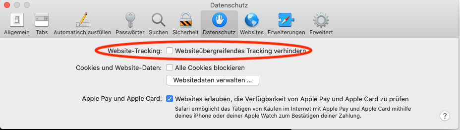 Die fehlerhafte Darstellung kann durch Browser Probleme verursacht werden, Safari zum Beispiel bereitet dabei Probleme. Ein bekannter Fehler entsteht, wenn in Safari das website-übergreifende Tracking verhindert wird. Falls die Teilnehmer*innen Safari benutzen, überprüfen diese am besten, ob in den Einstellungen an der folgenden Stelle der Haken NICHT gesetzt ist: